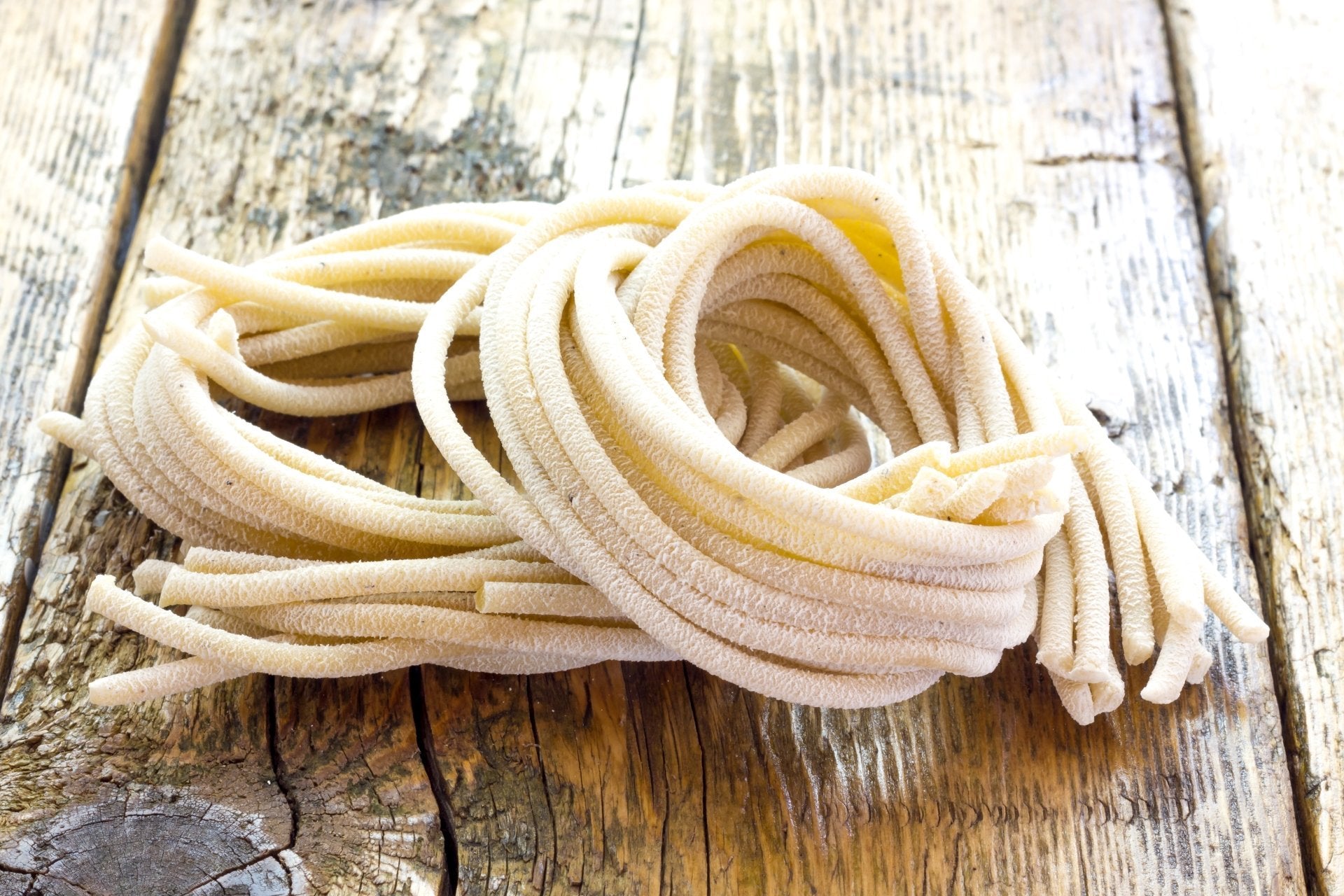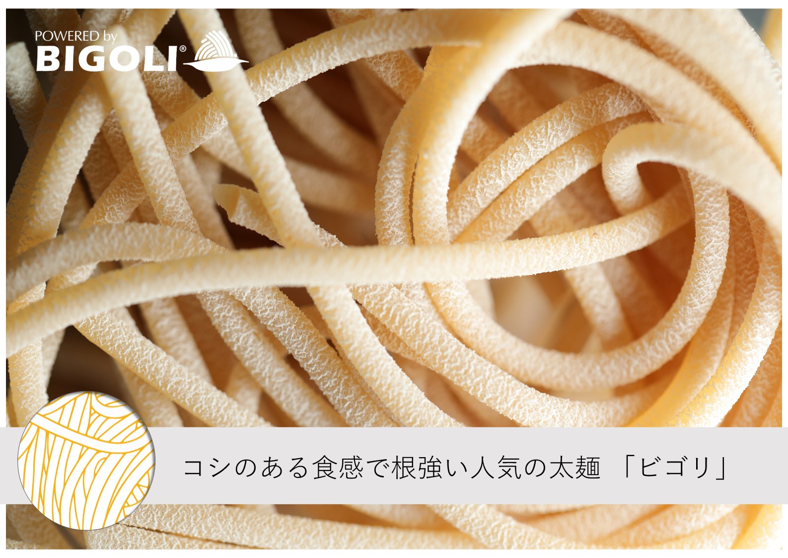 高級レストランでおなじみのビゴリは、日本人好みのモチモチした食感と強いコシが特徴の伊・ヴェネト州名産のパスタです。標準茹で時間は約4分。スパゲッティよりも強烈な圧力をかけて押し出して作る為、表面はザラザラしており肉系のソース(ラグー)との相性が良いとされています。